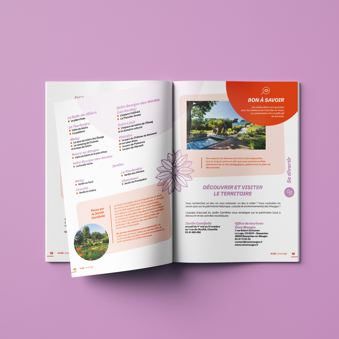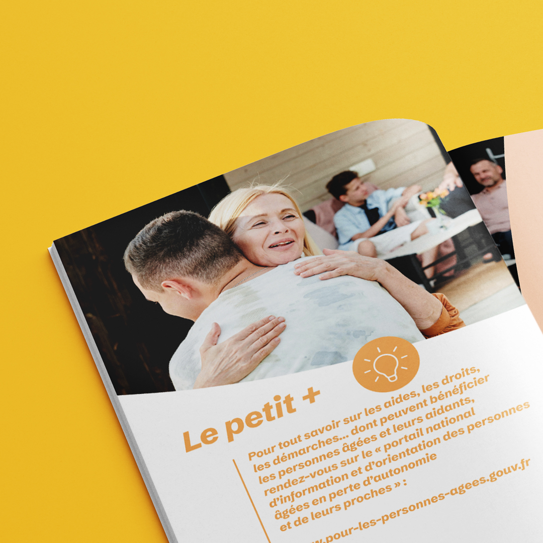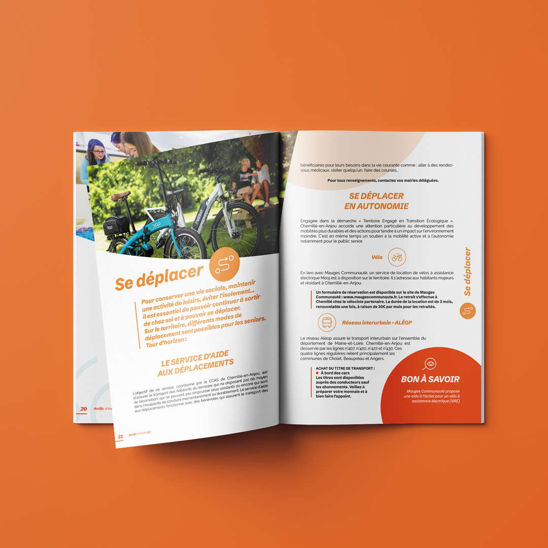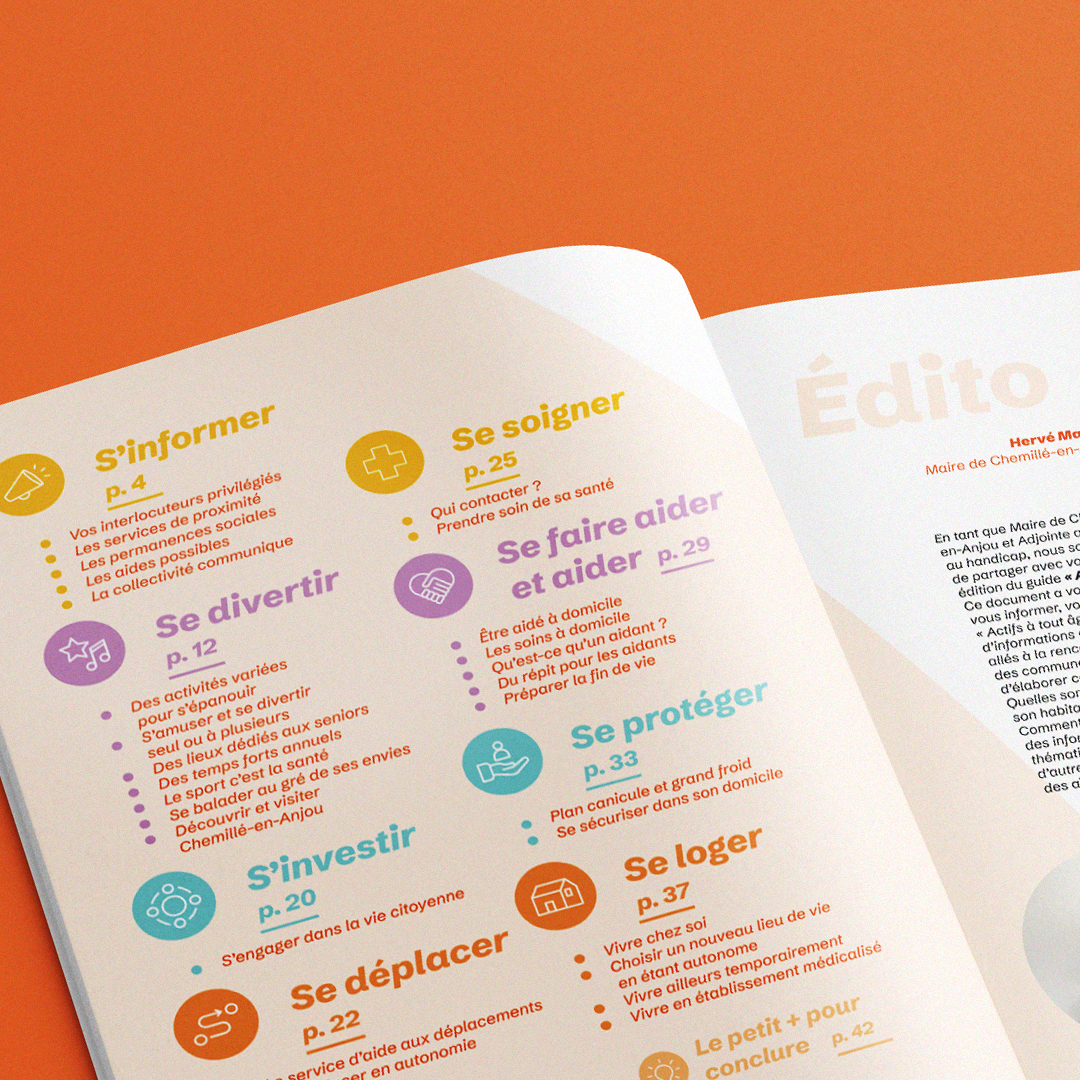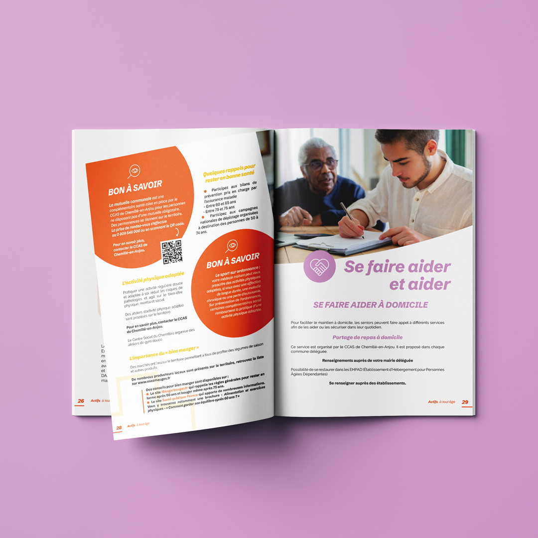 Mise en page du guide pratique à destination des seniors de Chemillé-en-Anjou, de leurs familles et de leurs proches aidants. Ce support décline la nouvelle identité de la ville mise en place par nos soins en 2023 : des couleurs franches, de la place pour les images et du confort de lecture.