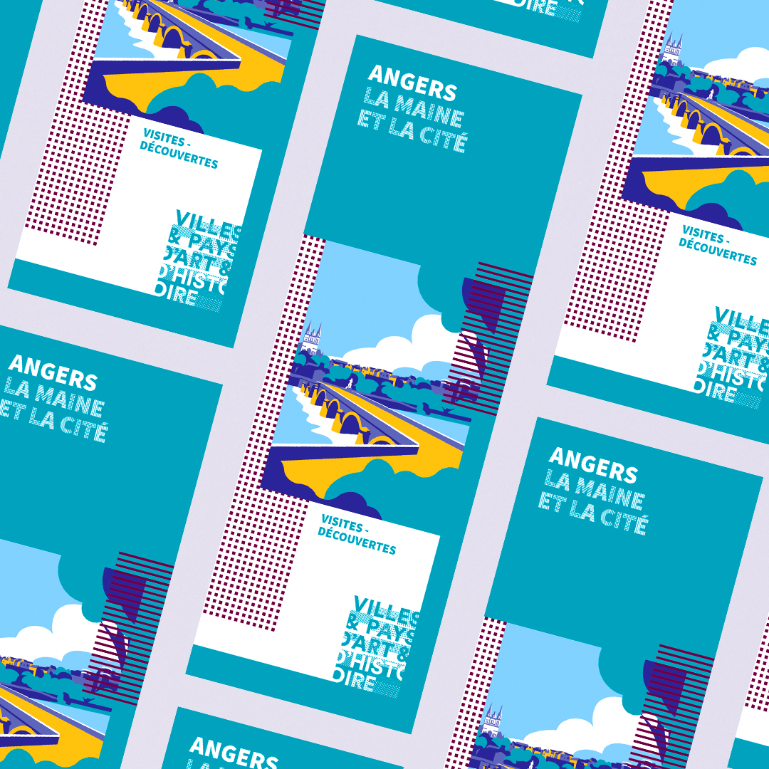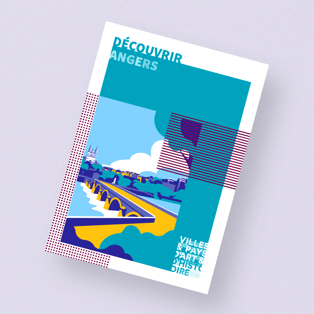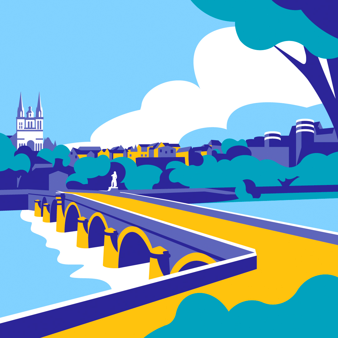 Illustration d’Angers pour le pôle culturel Le RU – Repaire Urbain : la Maine et la cité depuis le pont de Verdun. Déclinaisons imprimées : cartes postales / marque-pages / badges.