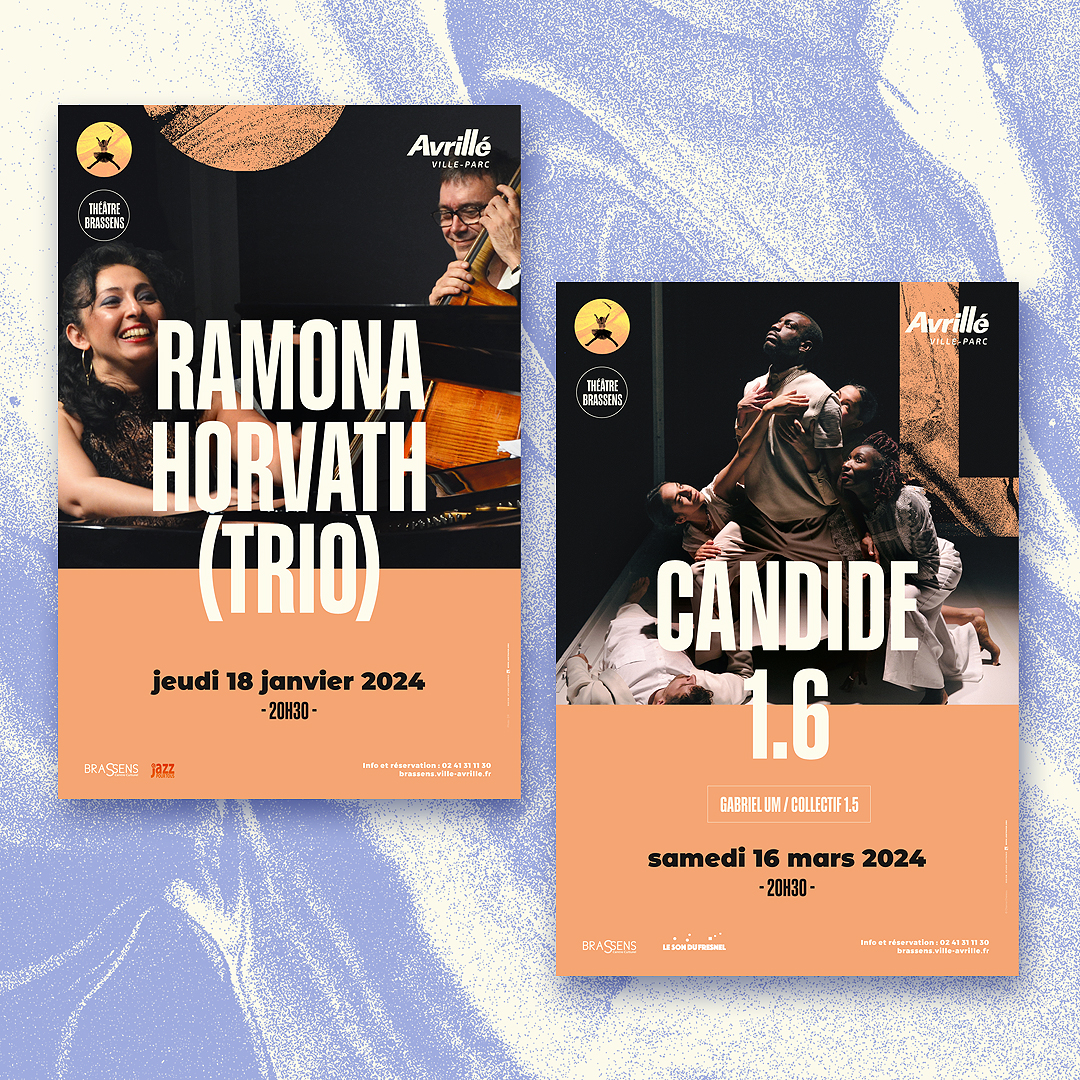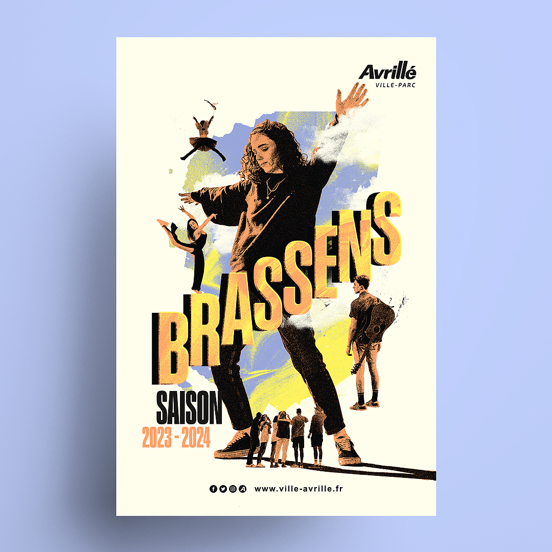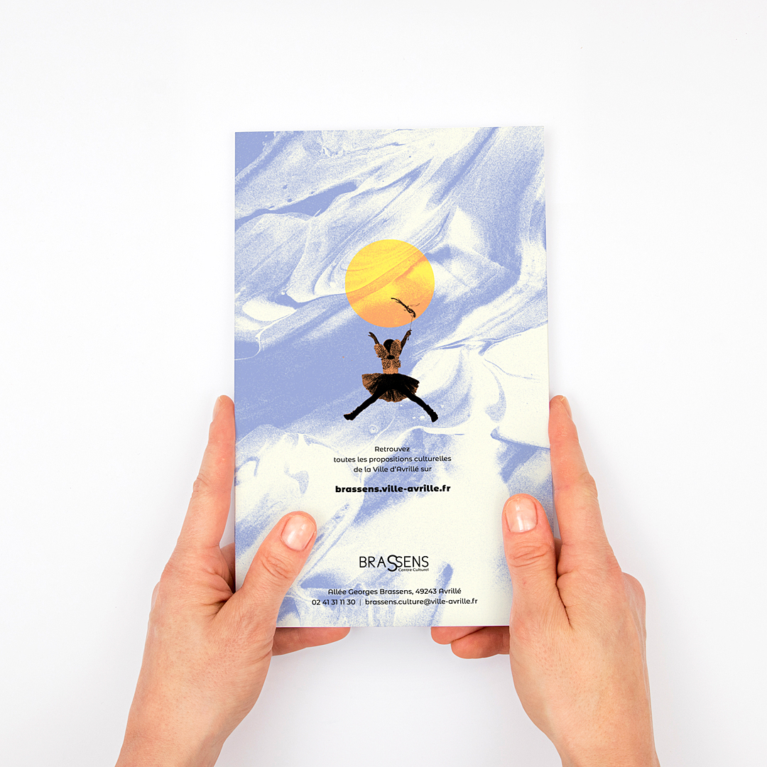 La ville d’Avrillé nous a confié une nouvelle fois l’identité de sa saison culturelle avec comme mot d’ordre « les pieds sur terre et la tête dans les nuages », clin d’œil à l’année des JO en France. Déclinaison de l’univers visuel sur les différents supports : programme, affiches spectacles, flyer, kakémonos…