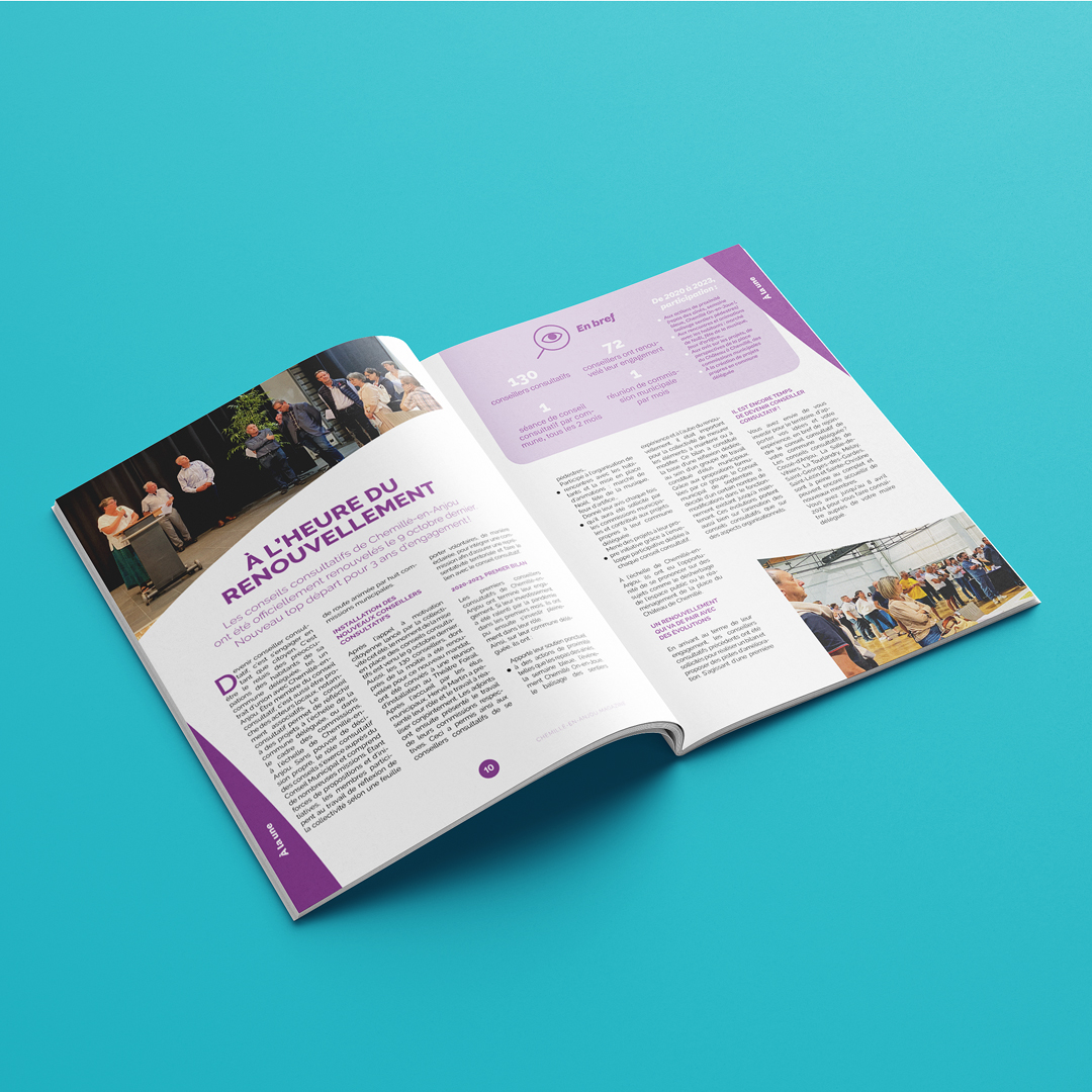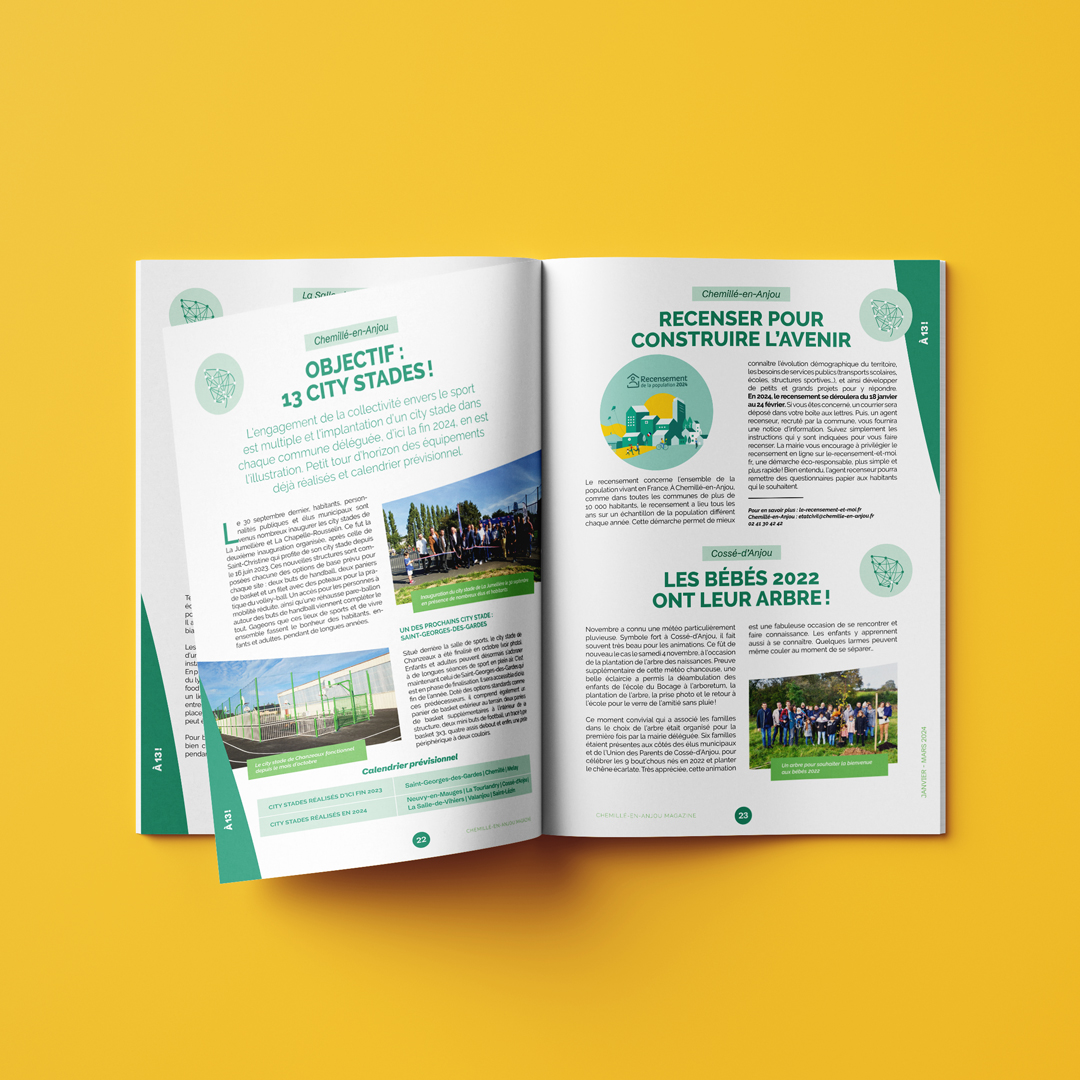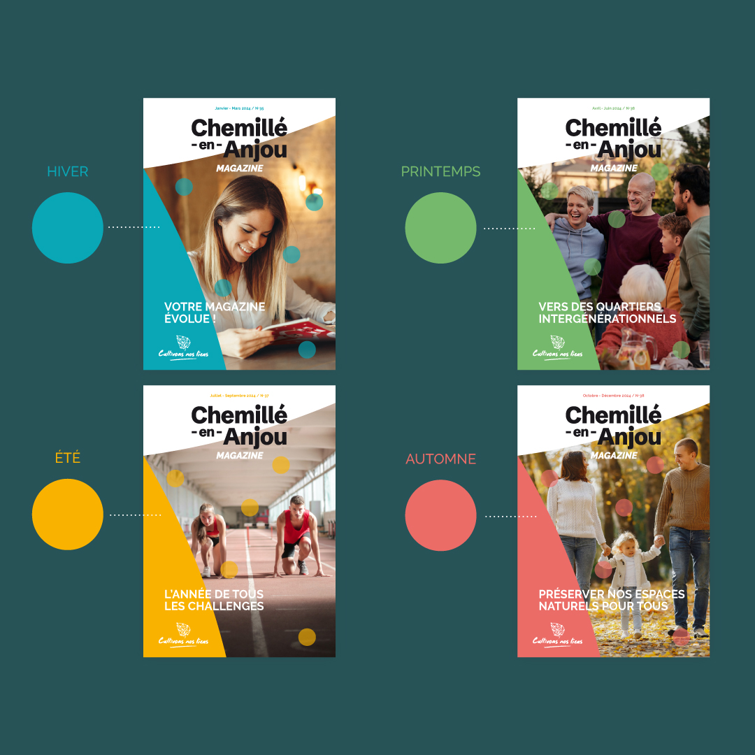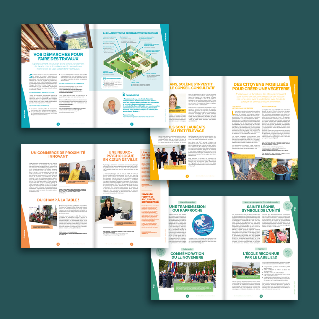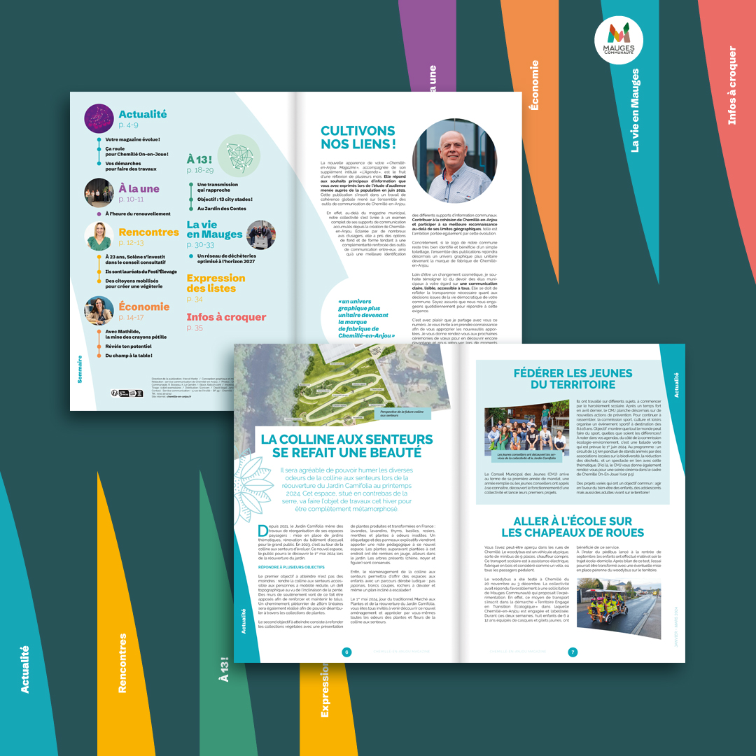 Nouvelle maquette du magazine d’information de Chemillé-en-Anjou, territoire au cœur des Mauges qui regroupe 13 communes déléguées. Ce support a été pensé en parallèle du développement de la nouvelle identité établie par nos soins, avec un nuancier ludique et une mise en page confortable au service d’un outil qui s’adresse à tous.