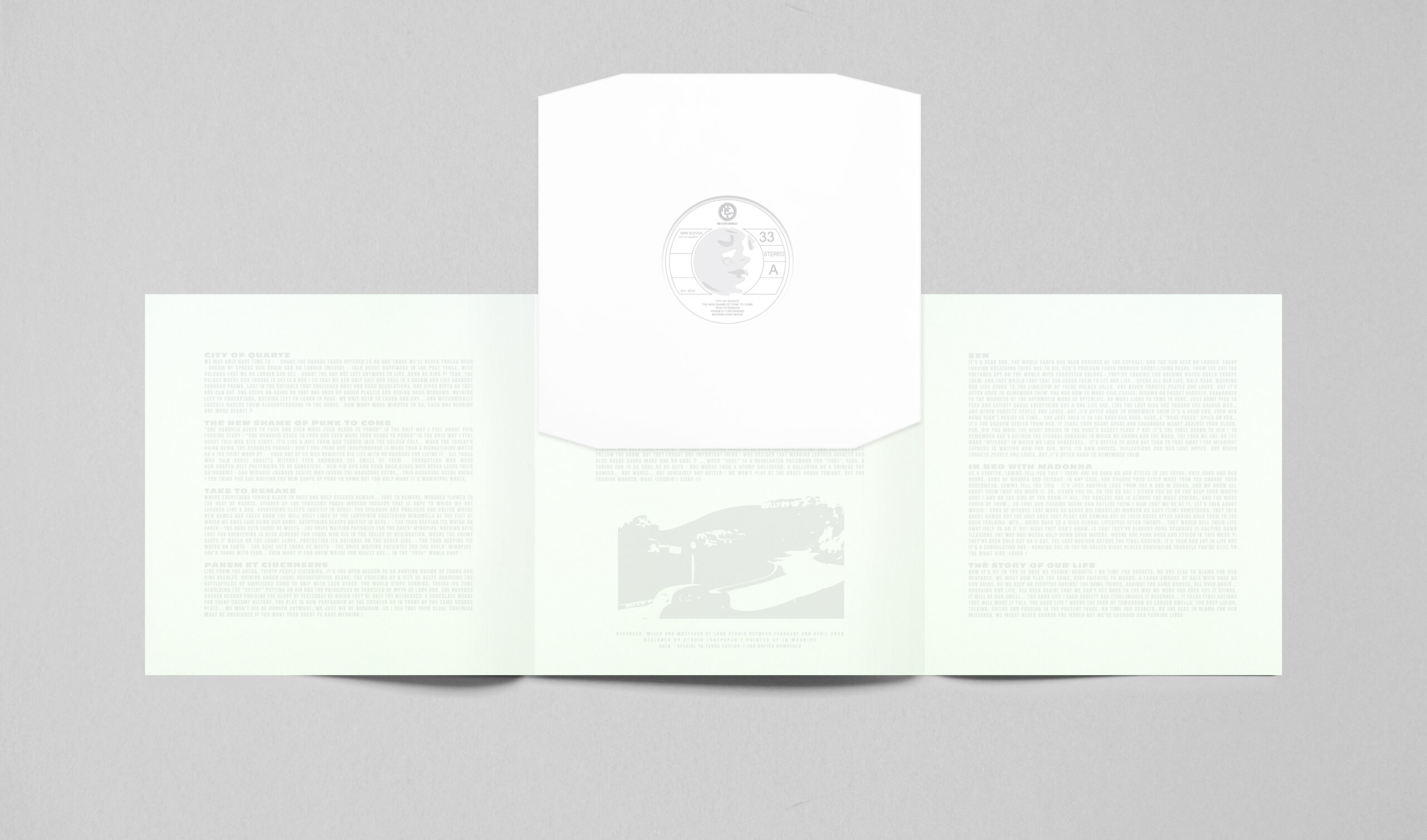 > Pochette avec marquage à chaud argenté recto / verso, livret 3 volets en sérigraphie 2 couleurs recto / 1 couleur verso, poster (65cm X 107cm déplié) : papier journal sérigraphie 1 couleur, vinyle blanc 140gr + discobag blanc.