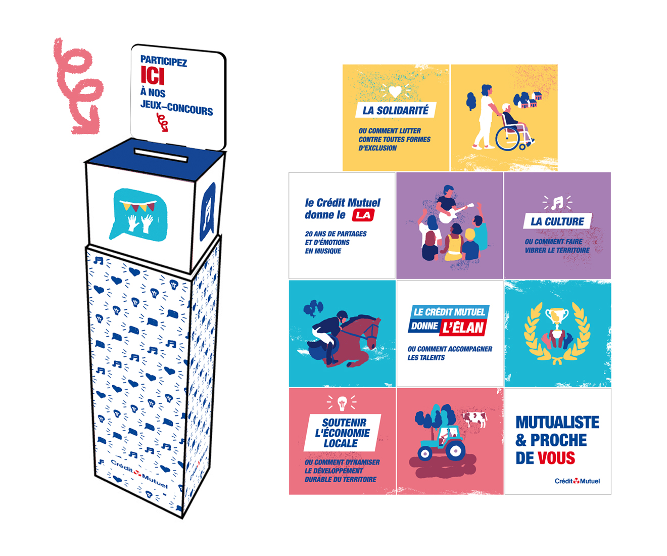 Le Mondial du Lion est une compétition de concours complet d’équitation créée en 1985 au Lion d’Angers. Le Crédit Mutuel de l’Anjou, en tant que partenaire historique de l’événement, nous a demandé de créer une identité reflétant ses valeurs pour habiller le mobilier présent sur leur stand lors de ce temps fort.