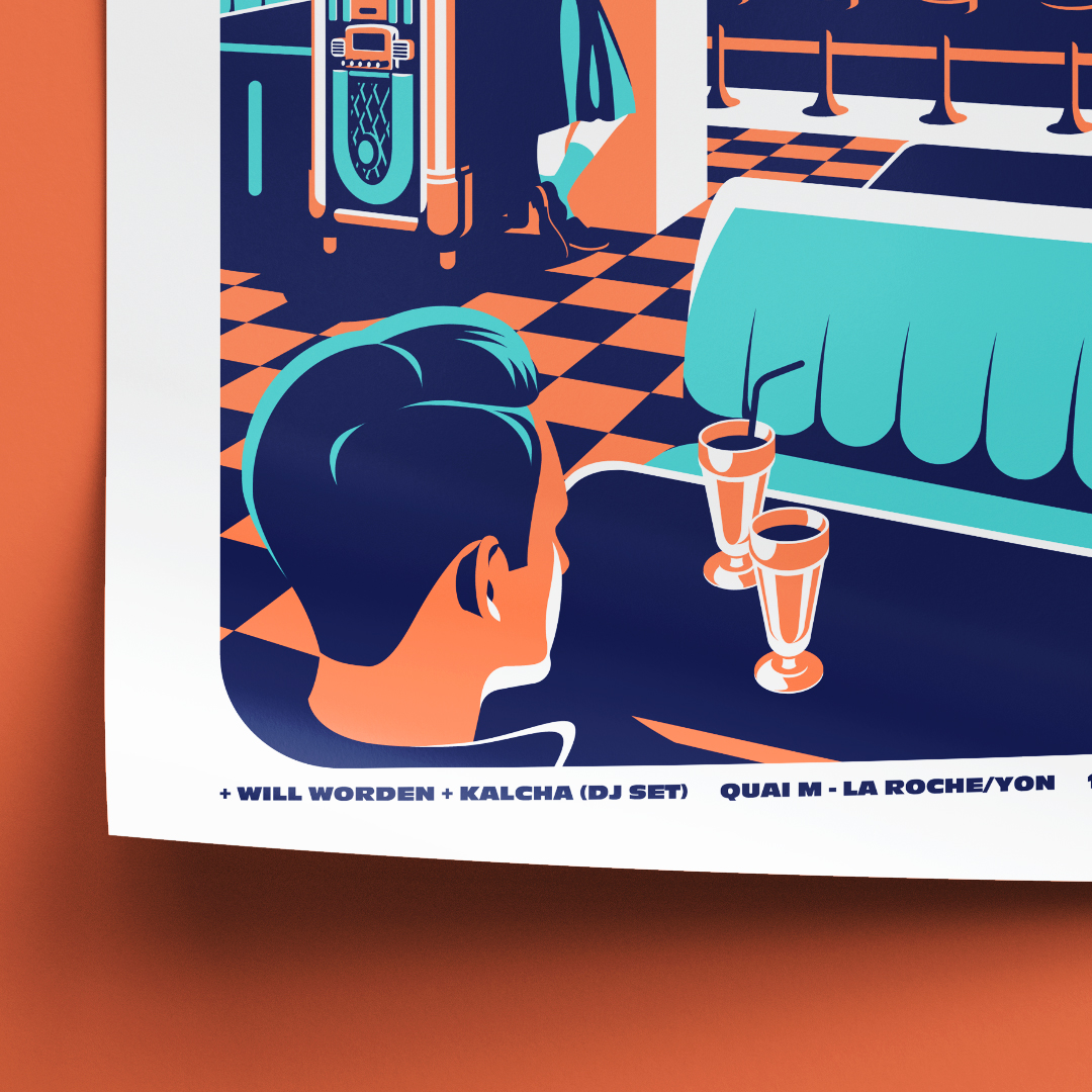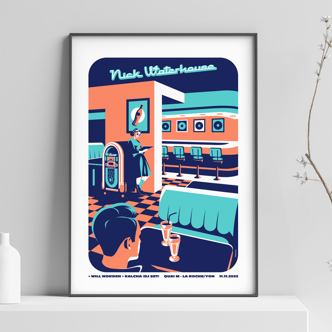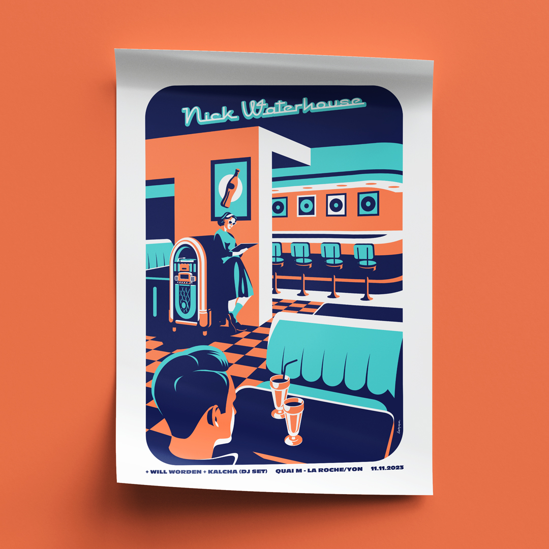 Ambiance dinner des sixties pour l’affiche de concert du chanteur de rhythm’n’blues américain Nick Waterhouse au Quai M le 11 novembre 2023.