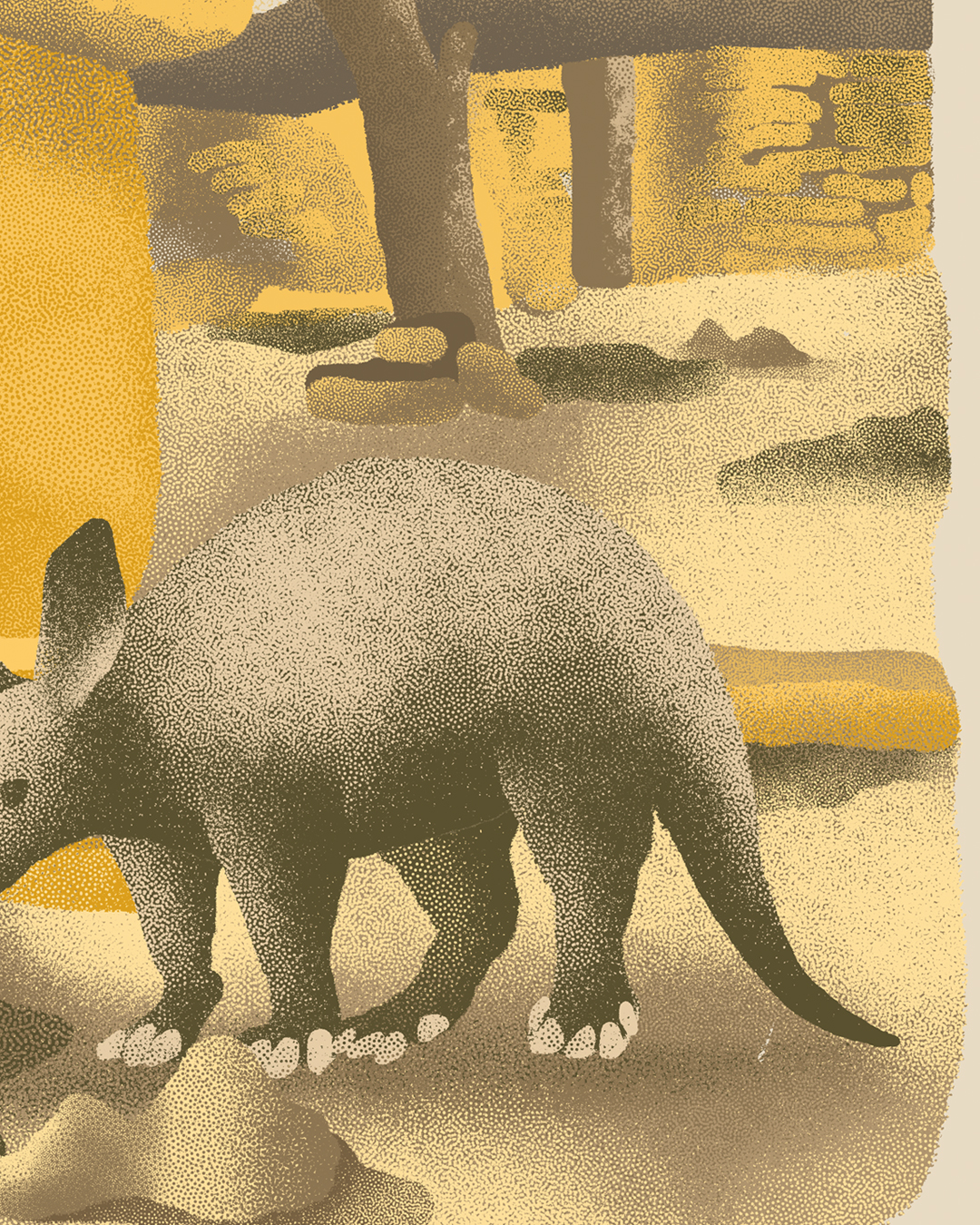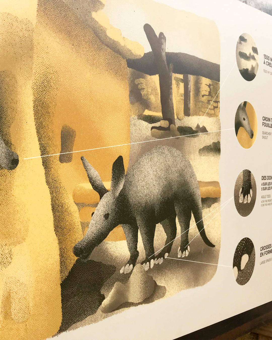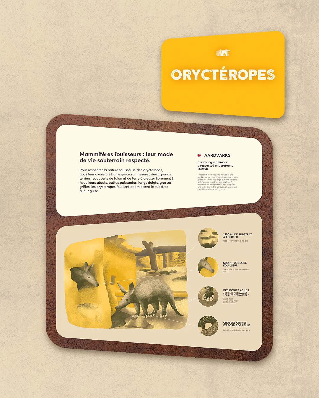 Illustration expliquant le mode de vie des oryctéropes dans leur espace au Bioparc de Doué-en-Anjou, en accord avec la nature de ces mammifères fouisseurs.
