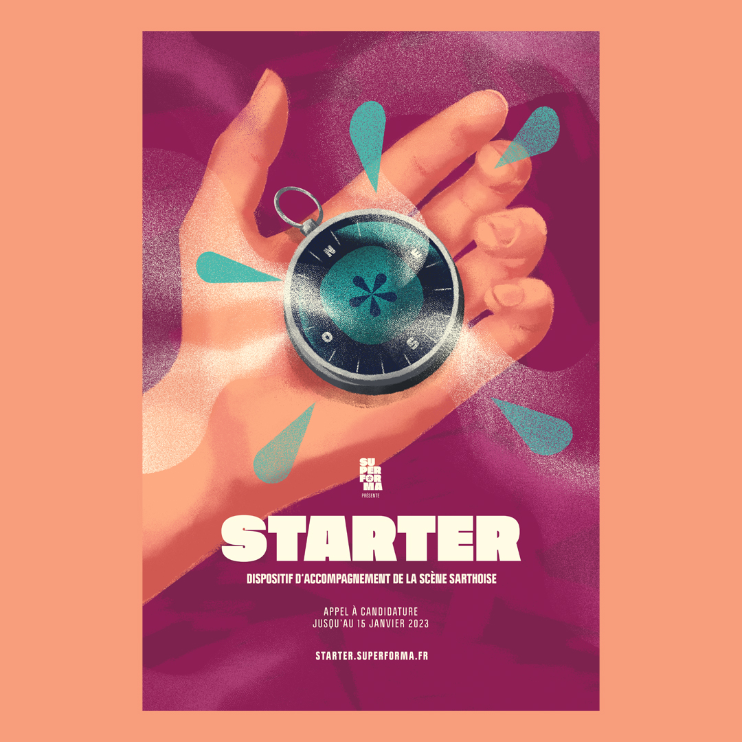 Pour l’édition 2023 de Starter (dispositif d’accompagnement de la scène Sarthoise), l’astérisque du logo de Superforma donne vie à une boussole qui indique le tempo…
