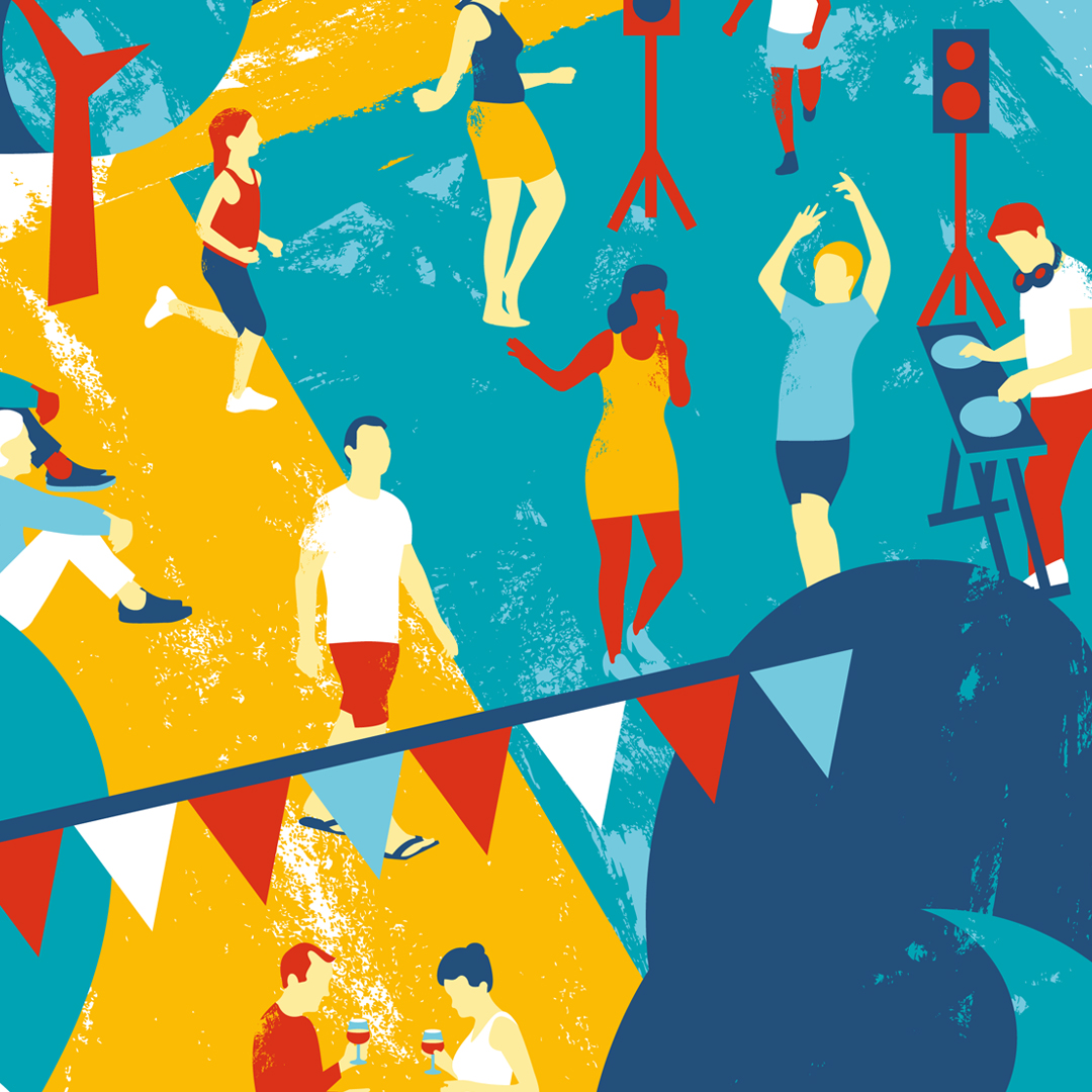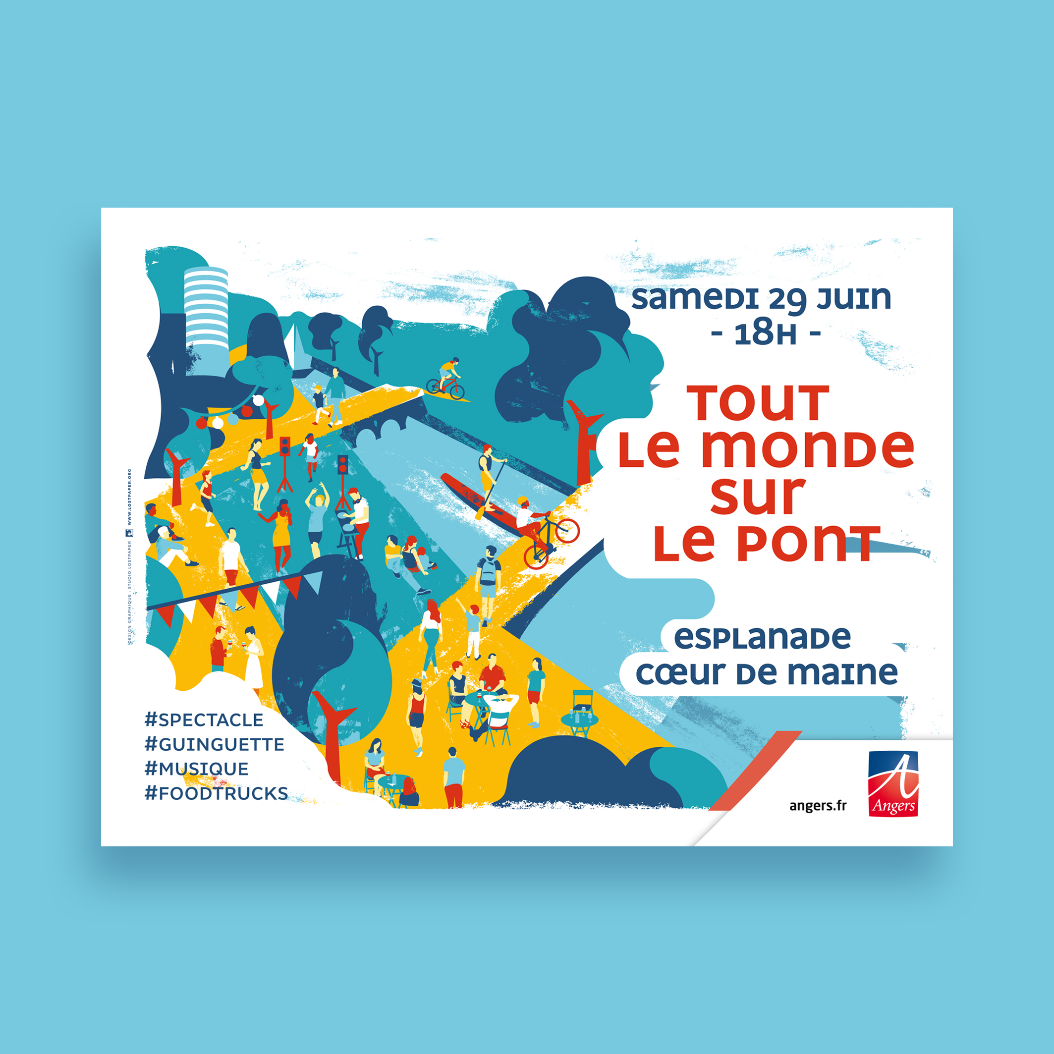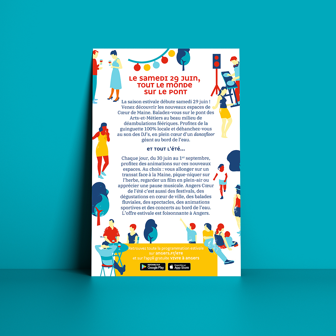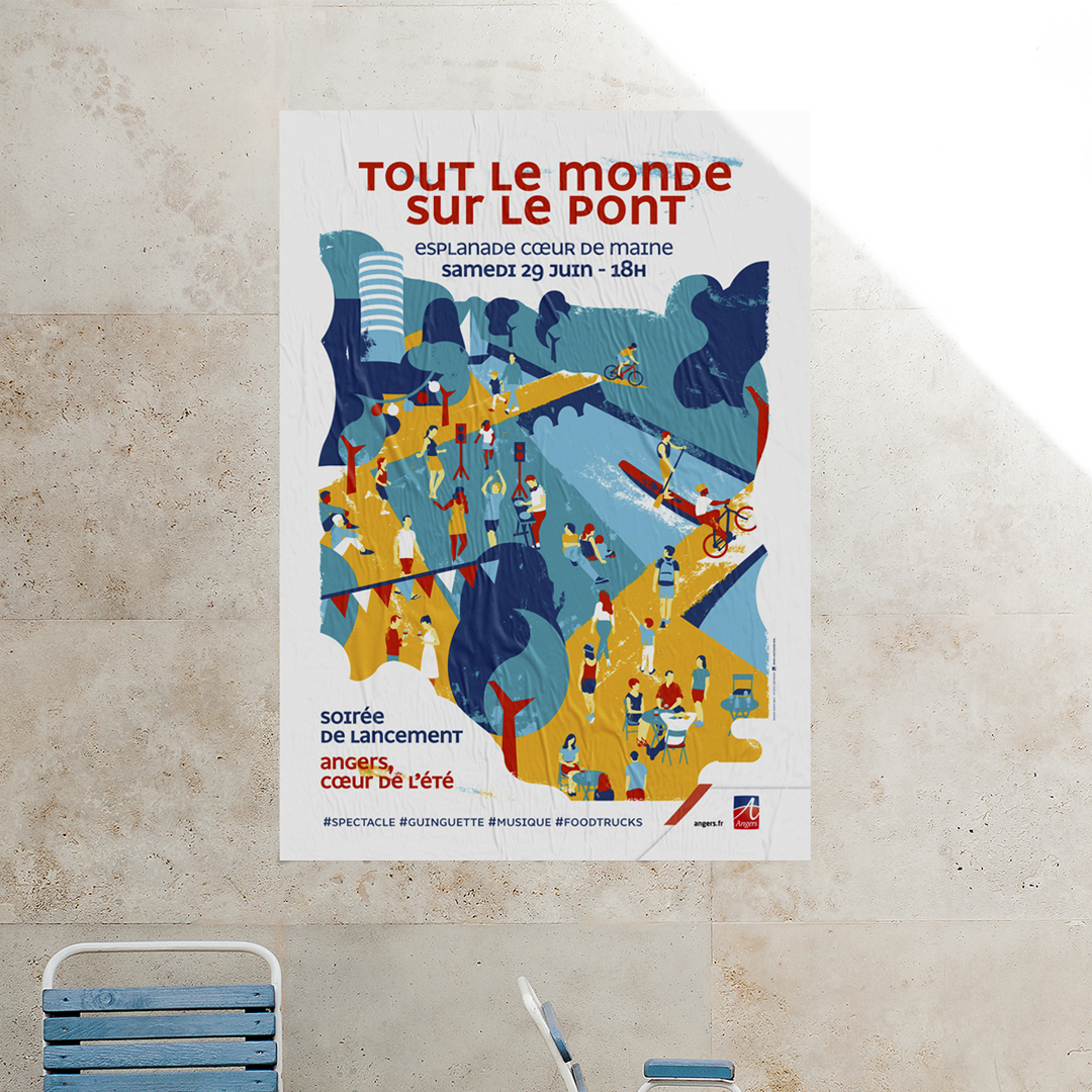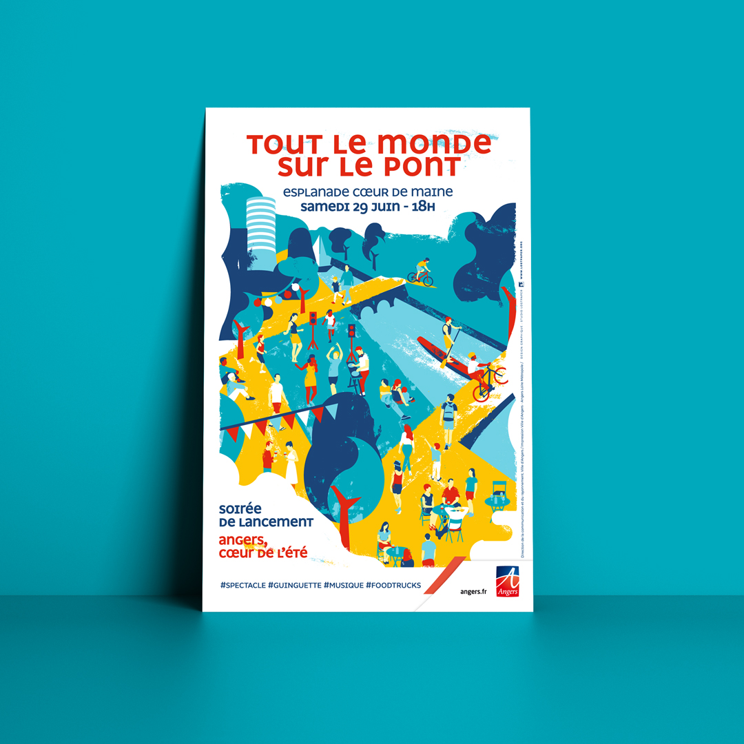 Illustration et affiche pour l’événement phare de la saison estivale 2019 de la ville d’Angers : l’inauguration de l’esplanade Cœur de Maine. Le visuel reprend les codes graphiques et les couleurs de l’identité de la saison réalisée par nous-même cette année-là.